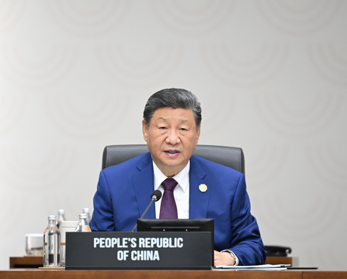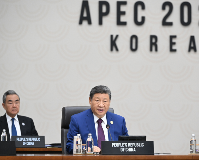 当地时间11月1日上午,国家主席习近平在韩国庆州出席亚太经合组织第三十二次领导人非正式会议第二阶段会议,并发表题为《共同开创可持续的美好明天》的重要讲话。新华社记者谢环驰摄